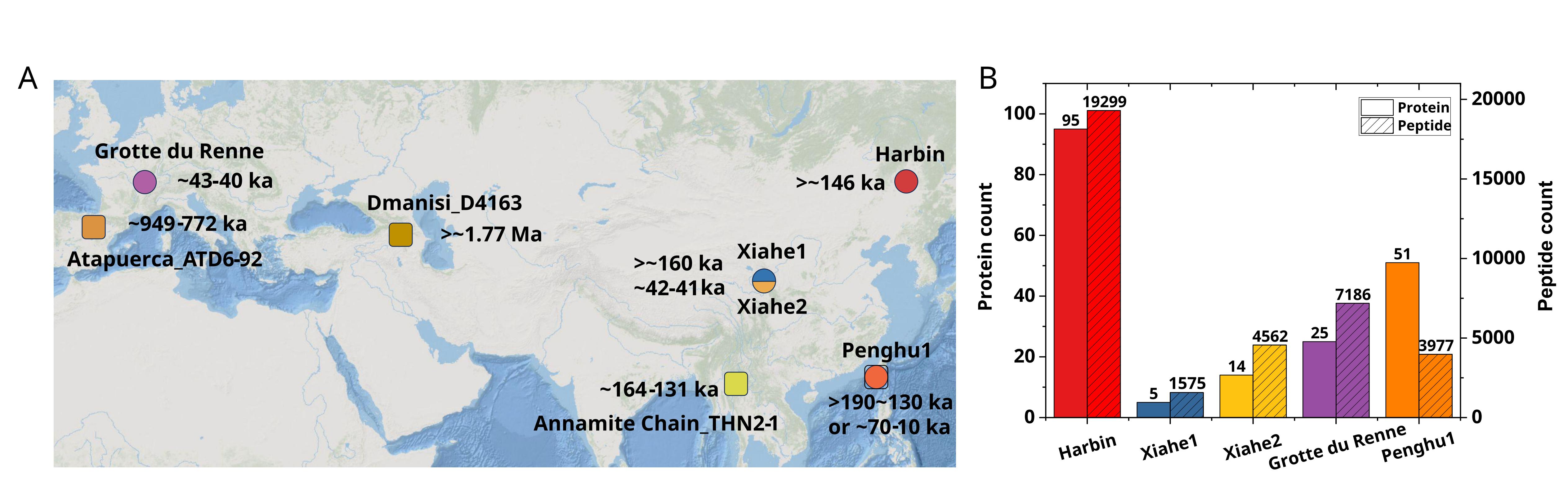 联合研究团队通过自主建立的古蛋白质组实验系统从哈尔滨古人类化石中获取到大量质谱数据,鉴定到308,458个谱图与20,455个肽段,通过降解相关修饰的分析确认了95种内源性蛋白质;这代表着目前已知最高质量的古人类蛋白质组数据,肽段数比此前基于同时期化石产生的数据多了11倍(图1)。该团队还首创了古蛋白全自动化鉴定人群分类的方法体系,发现122个在人科物种中特有的氨基酸突变位点。其中,102个黑猩猩、大猩猩和猩猩中的位点为衍生型,而哈尔滨古人类个体表现为100%匹配的祖先型;15个位点为人属衍生型,哈尔滨古人类个体表现为100%匹配的衍生型。因而,团队将哈尔滨古人类个体归入人属。同时,该研究团队发现4个丹尼索瓦人群特有的突变位点,包括1个祖先型位点和3个衍生型位点,3个衍生型位点匹配率高达86.57%(1个质量高,2个质量略低)。系统发育分析表明,该哈尔滨古人类个体与发现于丹尼索瓦洞穴的Denisova 3号个体构成单系类群(支持率98%-100%)。相关研究证实了其为丹尼索瓦相关人群,实现了完整头骨形态与分子证据的直接关联。