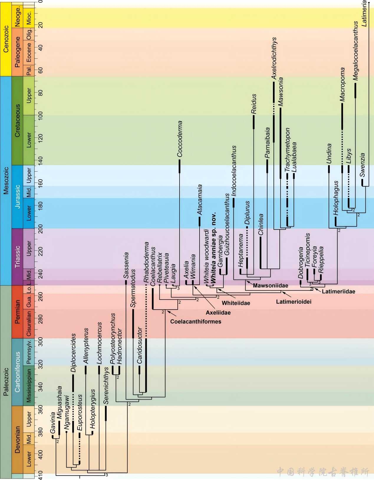 腔棘鱼类是一类生存了数亿年的肉鳍鱼类,其演化历史可追溯至早泥盆世,在由水生到陆生的四足动物演化中具有重要的研究地位。二叠纪末生物大灭绝之后,腔棘鱼类在三叠纪早期达到分类多样性的高峰,但在此时的亚洲,腔棘鱼化石记录极为零散,已知的两个属——中华腔棘鱼和巢湖鱼,均基于保存不佳的标本,限制了学界对腔棘鱼类演化格局的理解。为解决这一问题,中国科学院古脊椎动物与古人类研究所研究员徐光辉和巢湖学院戴清华等国内多家单位科研人员,在安徽和县早三叠世海相沉积地层(和龙山组)发现了两块保存精美的腔棘鱼化石标本。经详细对比研究,科研人员确认这些标本属于腔棘鱼目怀特鱼科,并建立了怀特鱼属一新种——安妮怀特鱼。
