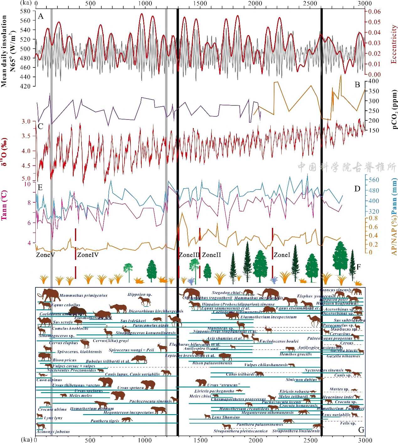 图4. 上新世晚期以来中国北部大型哺乳动物群与气候、植被的响应。(A) 红线为地球轨道偏心率,黑线为北纬65°处日均日照辐射量(Laskar等,2004); (B) 二氧化碳分压记录源自海洋岩芯硼同位素数据:紫线(Hönisch等,2009),橙线(Bartoli等,2011);(C) 氧同位素曲线(Lisiecki,2005); (D) 年均降水量(Pann);(E) 年均气温(Tann);(F) 树木花粉百分比;(G) 上新世晚期以来中国北方哺乳动物群主要代表物种的分布时期(Qiu,2006)。(华杰群和马嘉成 供图)