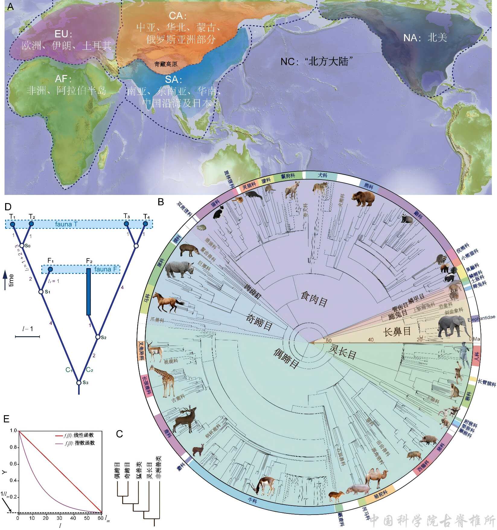 为了验证上述观点,研究团队收集并分析了海量化石数据,统计了北半球(亚洲、欧洲、非洲、北美)所有大型哺乳动物(涵盖9个目,50多个科,共1246个属)的信息。基于此建立了包含所有这些属的系统发育树;并提出了“物种间相互贡献率”的概念。简单来说,两个物种在这棵“族谱树”上的位置越接近(即亲缘关系越近),它们的相互贡献率就越高(数值在0到1之间)。在以上基础上,通过计算不同地理区域动物群之间所有物种对的平均贡献率,就能衡量任意两个动物群在演化上的亲疏远近(称为“动物群间关系”)。这种方法被称为“动物群系统发育贡献方法”。