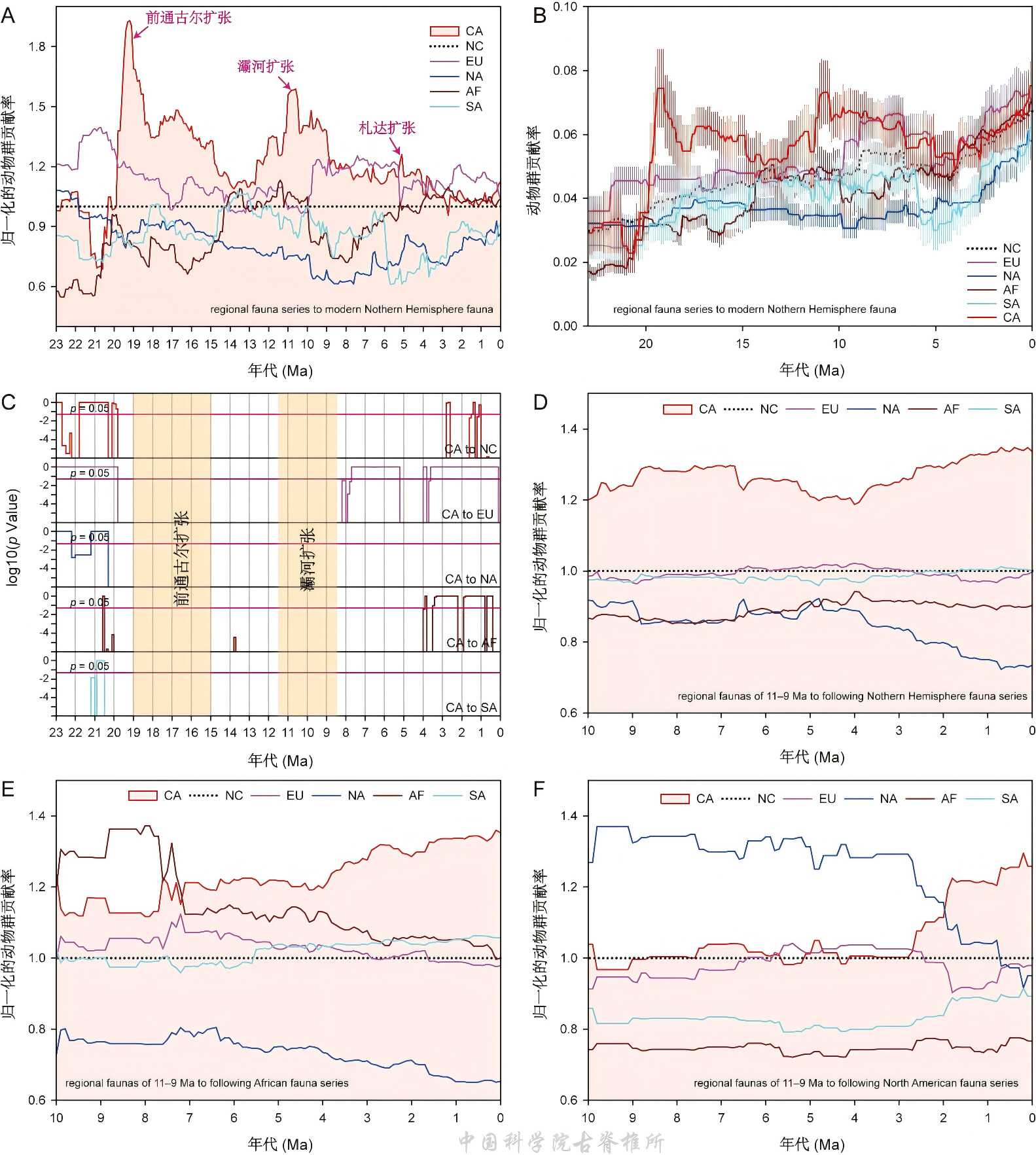 A. 北方大陆五大区域动物群组合相对于现代北方大陆动物群的贡献曲线。