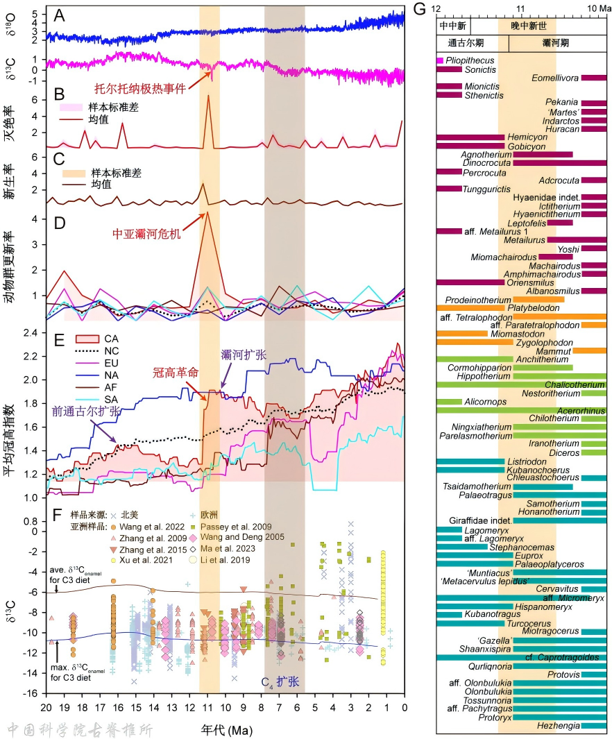 ·危机原因:青藏高原隆升加剧干旱:证据表明,这场危机很可能由青藏高原北部在约1200-1000万年前快速抬升至约3000米高度引发。高原阻挡水汽,导致其北缘地区干旱化急剧加重。来自准噶尔盆地和柴达木盆地的动物牙齿釉质碳同位素(δ¹³C)数据显示,早在1600多万年前,当地就已经存在相当开阔和干旱的环境,并在灞河期变得更加极端。值得注意的是,这次区域性危机的时间与全球气候记录中的一次短暂暖期(“托尔托纳极热事件”)有所重叠,这可能进一步加剧了动物群的更替压力(但其确切因果关系还需更多精确的年代标定来确认)。