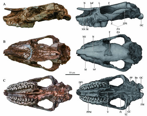 图1 甘肃庆阳桑氏大唇犀新种Chilotherium licentisp. nov.(TNP 03978)头骨,正型标本 A. 侧面;B. 背面;C. 腹面 (孙丹辉供图)